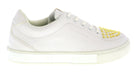 Versace Jeans Couture gives the classic sneaker a signature over the top makeover. This urban-cool KIM pair come in a sleek faux leather with gold tone studs and a chunky sole, polished off with a discreet embossed logo lettering for a designer finish. This striking style will lend a fashion-forward edge to every look.