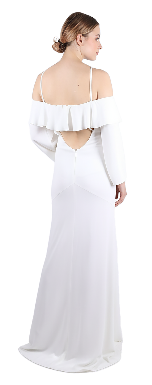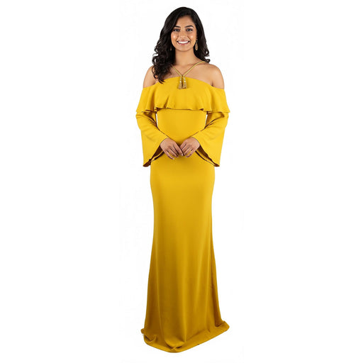 Brighten any room with this eye-catching golden yellow off-shoulder maxi dress. Featuring a flowy ruffle neckline, flared sleeves, and a striking o...