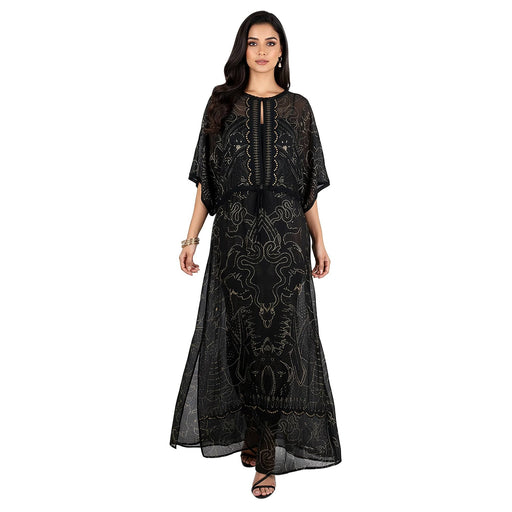 View full detailsRoberto Cavalli Boho-Chic Black Maxi Kaftan Dress Gold Print Details
