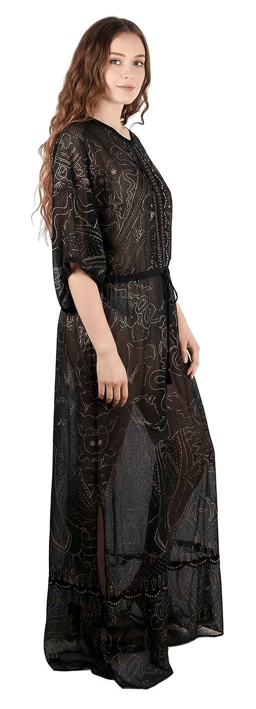 Channel effortless elegance with this boho-inspired black maxi dress. Featuring intricate print, sheer details, and a relaxed silhouette, this dres...