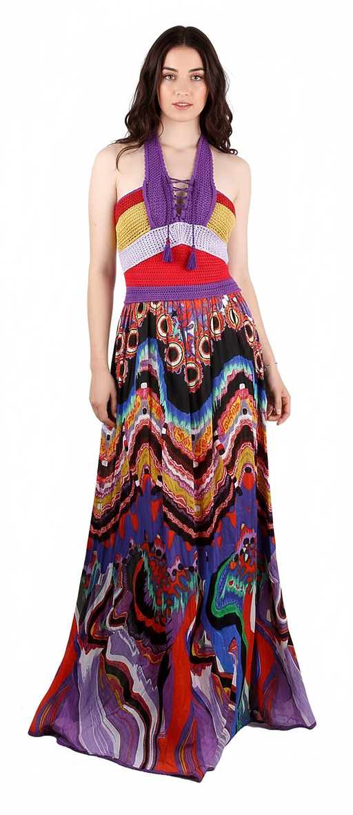 Make a bold statement with this bohemian-inspired multicolor halter maxi dress. Featuring a vibrant patchwork print, a playful lace-up front, and a...