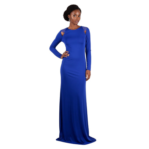 Elevate your wardrobe with this sleek and modern royal blue maxi dress. Featuring long sleeves and stylish sheer shoulder accents, this dress is bo...