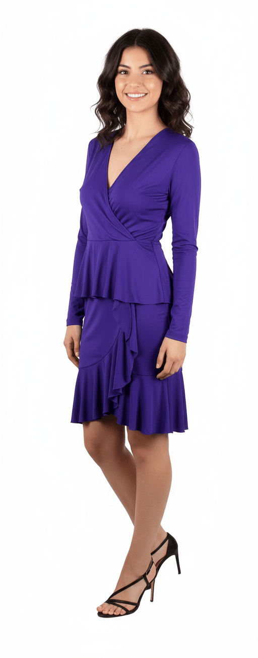 Step out in style with this royal purple peplum cocktail dress. Featuring a flattering V-neckline, long sleeves, and a fitted bodice with a layered...