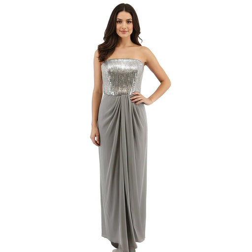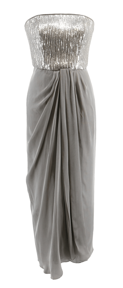 View full detailsEmporio Armani Silver Beaded Column Strapless Gown