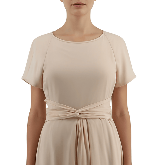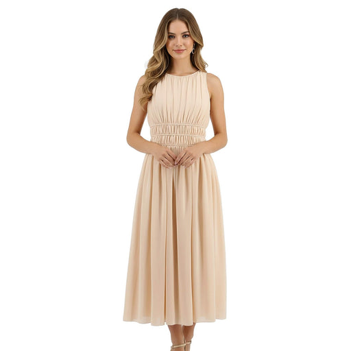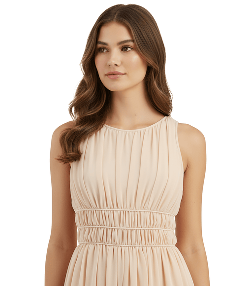 Soft and romantic, this light-peach silk chiffon midi dress captures effortless elegance. Crafted from airy 100% silk, it features a sleeveless bod...