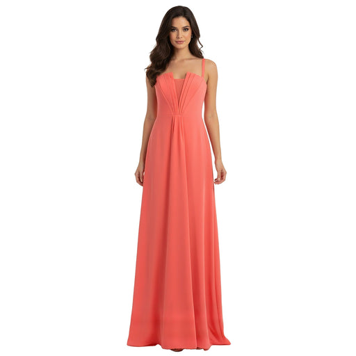 Radiate modern elegance in this striking coral evening gown. Crafted from smooth, structured fabric, it showcases soft architectural pleats that fa...