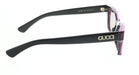 Acetate styles with a bi layered color effect which guarantee a cool look and feel. Rectangular cat-eye. Gucci lettering logo placed under the laque of the construction. Commercial yet cool color palette featuring at least two color combinations.