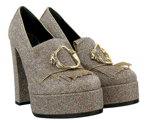 Founded in Italy, Roberto Cavalli's iconic Italian style has been given a retro-cool vamp. The block heel pump loafers are crafted from glittery fi...