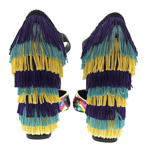 These vibrant, party-ready heels are bursting with personality—featuring multicolor sequins, fringe-covered block heels, and jeweled ankle straps t...