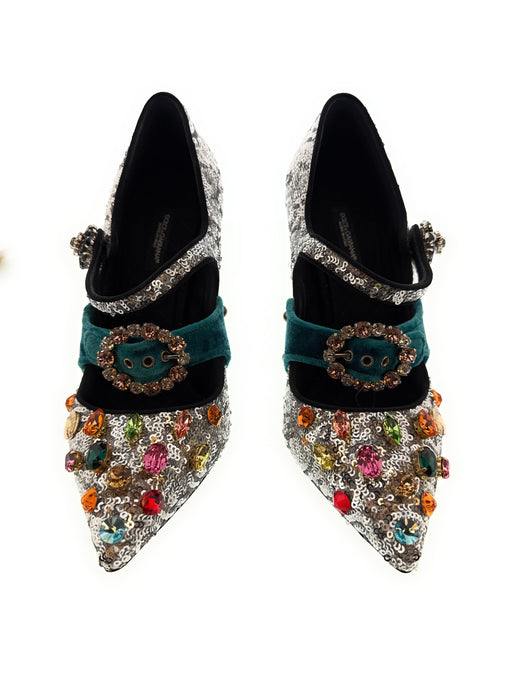 Step into pure glamour with these dazzling Dolce & Gabbana pumps, featuring shimmering silver sequins, multicolor jewel embellishments, and lux...