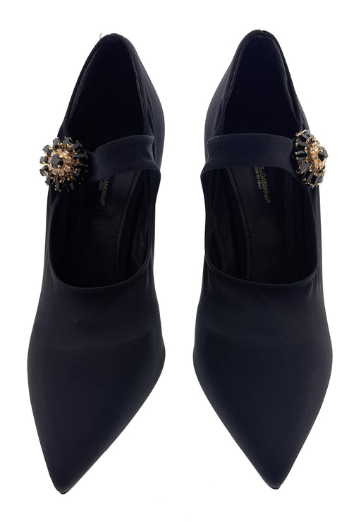 These sophisticated black Dolce & Gabbana Mary Jane pumps feature a stretch jersey finish with a crystal-embellished brooch buckle, blending co...