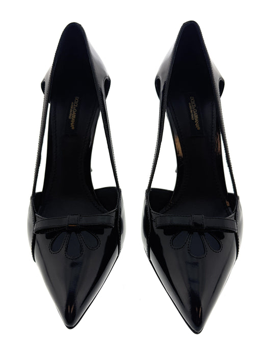 These classic black Dolce & Gabbana pumps feature a glossy patent finish and a delicate bow accent, offering timeless elegance with a touch of ...