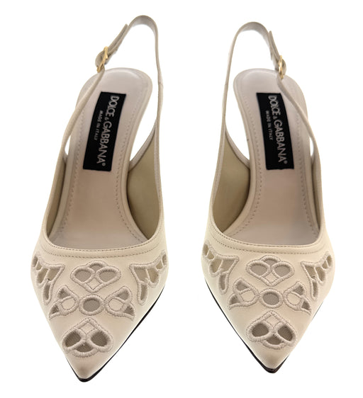 Step into effortless elegance with these ivory Dolce & Gabbana slingback pumps, featuring delicate embroidered cut-out details for a romantic t...