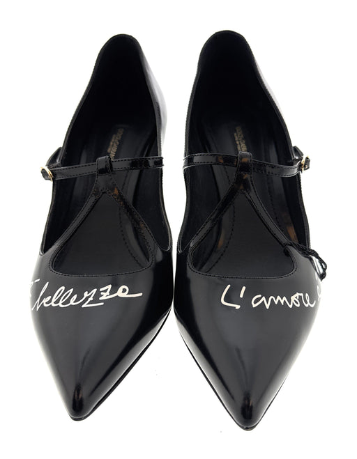 These refined black T-strap pumps add a poetic twist to timeless elegance, featuring the handwritten Italian phrase "L’amore è bellezza"—“Love is b...
