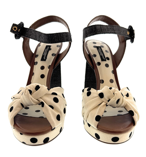 Elegant Dolce & Gabbana platform sandals featuring an eye-catching black polka dot print on cream fabric with a statement bow detail. Designed ...