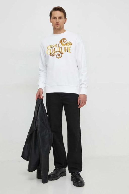Elevate your casual wardrobe with this refined white sweatshirt from Versace Jeans Couture, featuring the iconic logo wrapped in golden baroque flo...