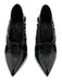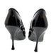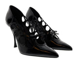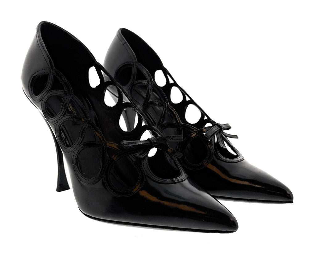 These avant-garde black patent heels feature a bold cut-out design with circular patterns and delicate bows, blending modern artistry with timeless elegance.