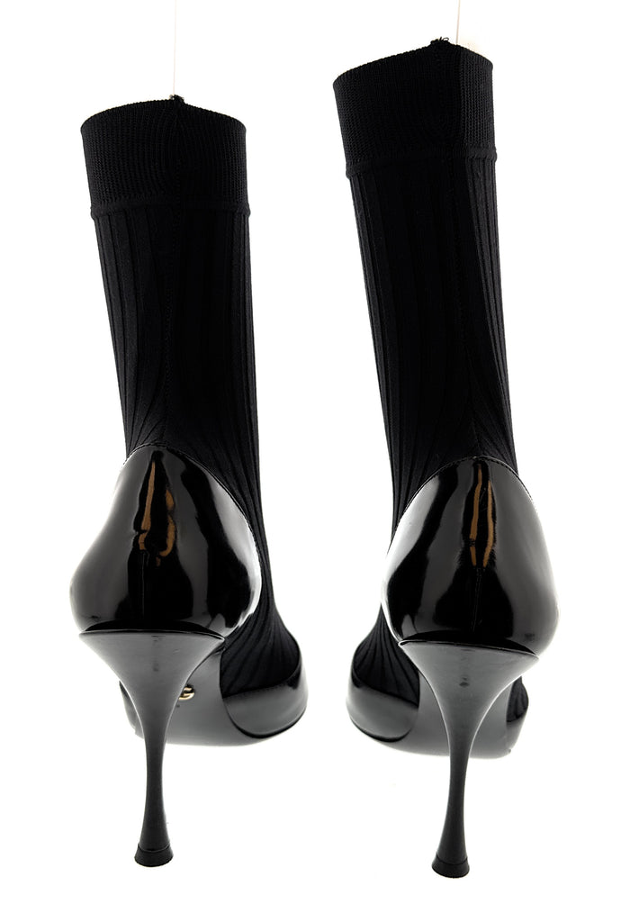 These Dolce & Gabbana sock boots combine sleek patent leather with ribbed stretch knit for a modern, sculpted silhouette with dramatic flair.