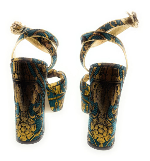 View full detailsDolce & Gabbana Gold Brocade Block Heel Platform Sandals-39