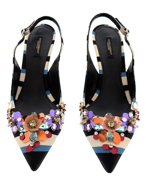 View full detailsDolce & Gabbana Striped Slingback Heels with Crystal Floral Embellishment -EU41