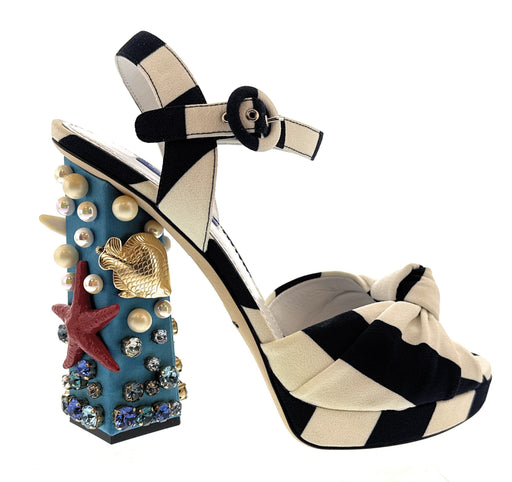 Dive into bold Italian glamour with these Dolce & Gabbana platform sandals featuring black and white striped uppers, sculptural ocean-themed bl...