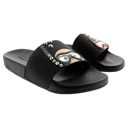 Add a playful edge to your casual wardrobe with these black Dolce & Gabbana slides featuring quirky cartoon appliqués and bold metallic stud ac...