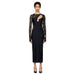 This black midi dress masterfully blends sultry sophistication with intricate design. Lace-panel sleeves, asymmetric cut-outs, and corset-inspired lacing detail create a striking silhouette made to command attention.