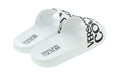 Step into summer with these striking white slide sandals featuring an all-over black graphic logo print. Perfect for poolside lounging or urban strolls, these slides blend casual ease with modern streetwear flair.