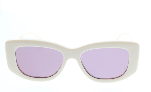 These refined cat?eye sunglasses pair a creamy ivory injected-acetate frame with elegant gold-tone metal accents, softened by violet lenses for a c...