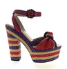 A vibrant celebration of summer style, these Dolce & Gabbana raffia sandals feature bold purple, red, and cream stripes with playful woven bows. The chunky platform heel brings both height and comfort—perfect for garden parties, beach weddings, or statement city strolls.